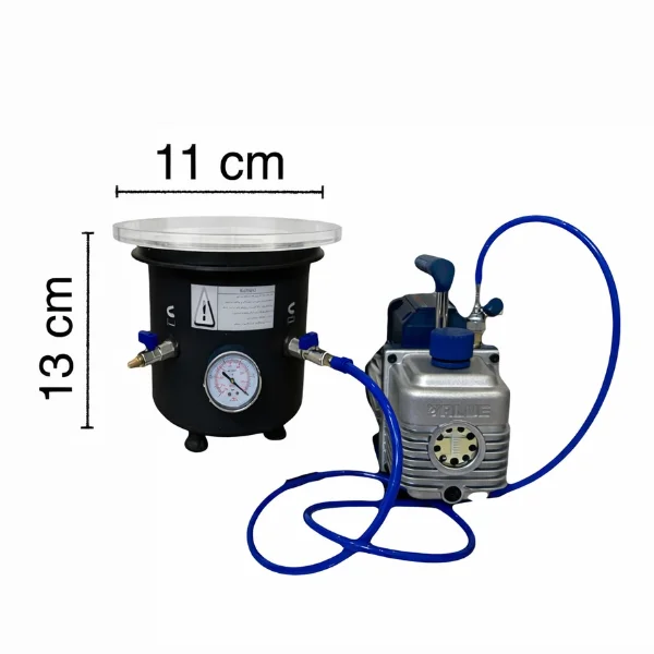 دستگاه وکیوم حباب گیر یک سیستم حبابگیري مایعات مختلف تحت خلأ و در محیط ایزوله بوده و به کمک این سیستم می توان انواعچسب، رزین، قالبهاي سیلیکونی، نانولوله هاي کربنی، نانولوله هاي سیلیکونی،پلیمرها، بردهاي الکترونیکی و … را حبابگیري نمود. اینسیستم از قسمتهاي مختلفی نظیر محفظه استوانه اي، درب شفاف، شیرهاي خلأ استاندارد، پمپ خلأ و گیج خلأ تشکیل شده است. عمربالا، کاربري آسان و گسترده از ویژگیهاي این دستگاه می باشد. مخازن حبابگیري در سایزهاي مختلف تولید میشوند و پمپ وکیوم متناسب با حجم مخزن در نظر گرفته می شود. پمپ هاي وکیوم از نوع روغنی بوده و فشار نسبی کمتر از منفی0/85 بار (در تهران) را ایجاد می کنند که فشاري مطلوب جهت حبابگیري می باشد. این دستگاه ها راه حلی ایده آل براي تخلیه حبابهايمحبوس در مایعات با ویسکوزیته بالا می باشد. مخزن خلأ (وکیوم چمبر)